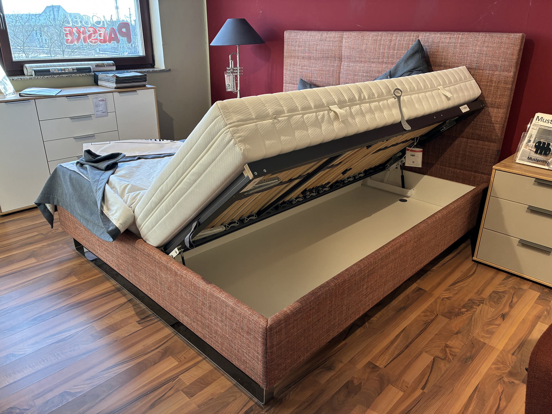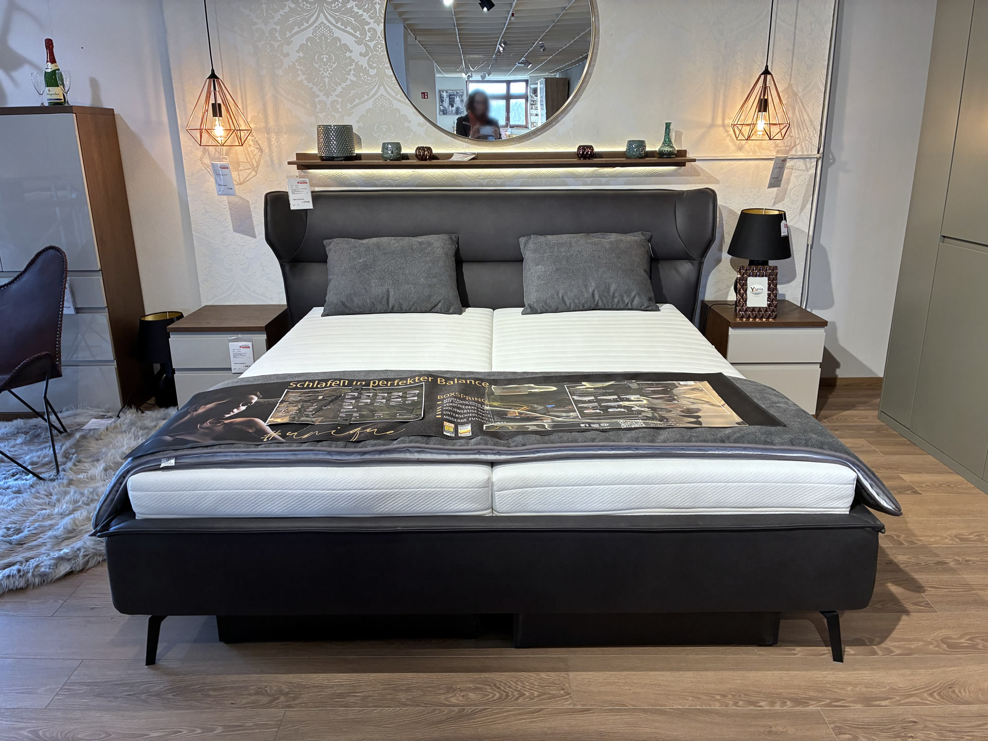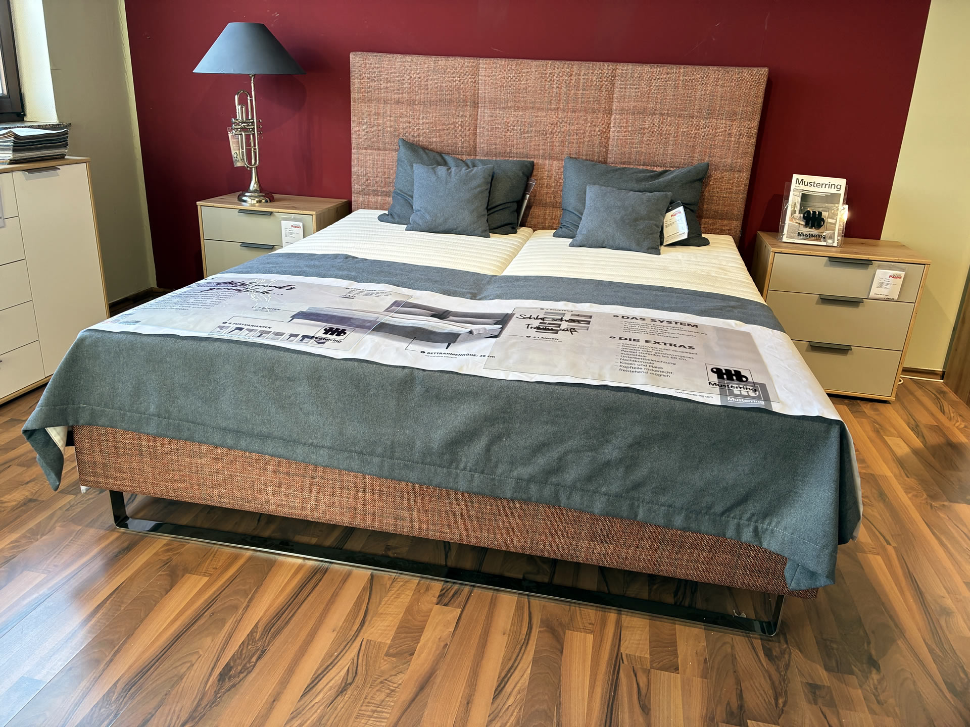 Sie wollen gut schlafen ? Es gibt ein Musterring Boxspringbett in bester Qualität ! Ausgestattet mit Unterbau in Taschenfederkern, Obermatratze in Taschenfederkern mit 1000 Federn H 3 + 4 und Topper als Visko-Klimatopper durchgehend. Abgerundet durch die schwebende Optik, der Matratzenbezug mit der Pfeifensteppung und das Kassettenkopfteil mit Steckdose, USB-Anschluß und Beleuchtung für den Unterbau. Liegefläche ca. 180x200 cm