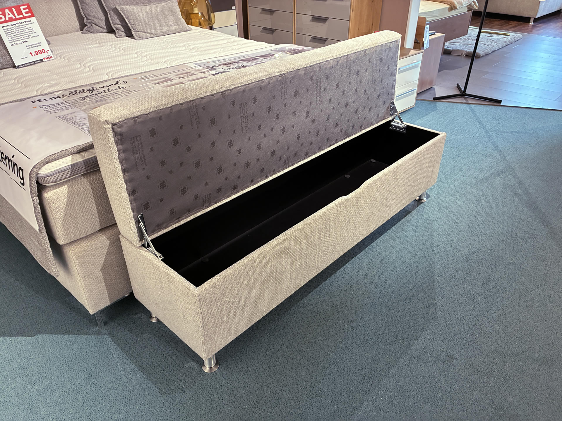 Passend zum Boxspringbett Musterring Felina Basic gibt es eine Ankleidebank mit Stauraum in weichem Stoffbezug. Breite ca. 160 cm, Tiefe ca. 45 cm, Höhe ca. 51 cm