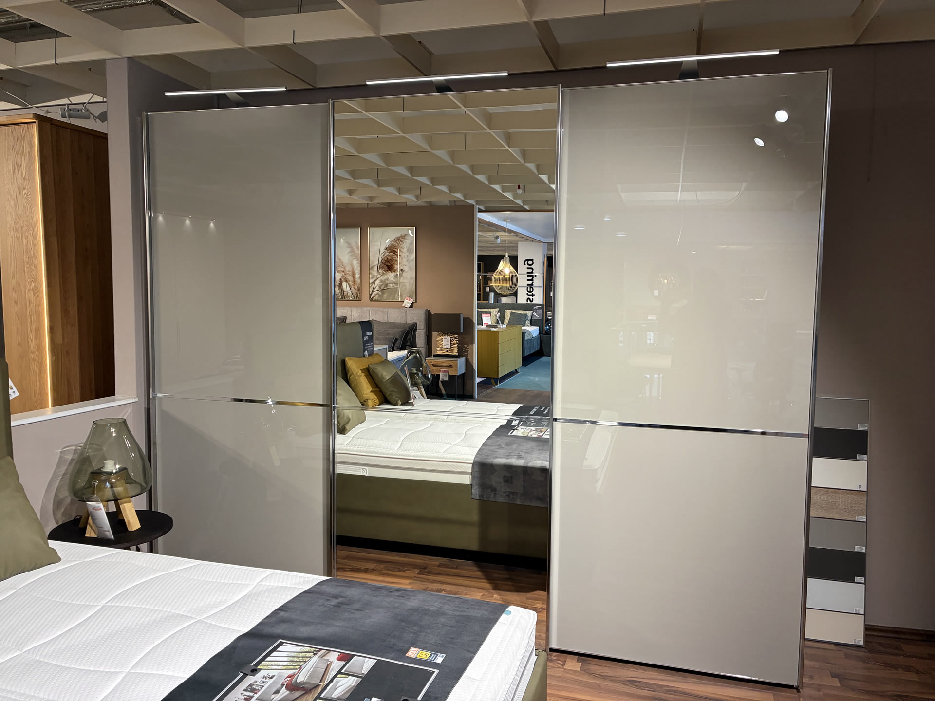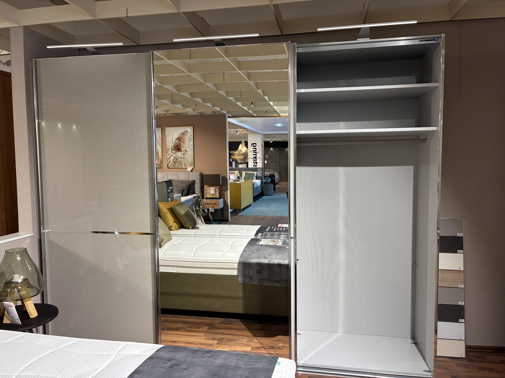 Moderner Schwebetürenschrank in Musterring-Qualität aus Eiche bianco teilmassiv kombiniert mit Glastüren in Champagner. Inklusive Kollisionsdämpfer, Selbsteinzug, Passpartout-Rahmen mit LED-Beleuchtung. Innenausstattung mit Einlegeböden, Kleiderstangen und Schubkasteneinsatz. Größe ca. Breite 256 cm, Höhe 240 cm, Tiefe 68,7 cm.